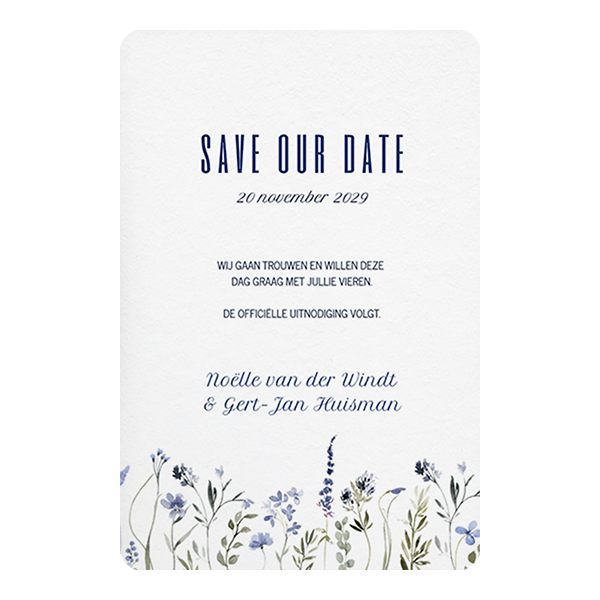 Stuur een originele Save the Date kaart. Dit is een Save the Date kaart met illustraties van blauwe bloemen. In de editor pas je de teksten en illustraties aan. Zo stuur je altijd een persoonlijke en unieke kaart. HOE WERKT HET?