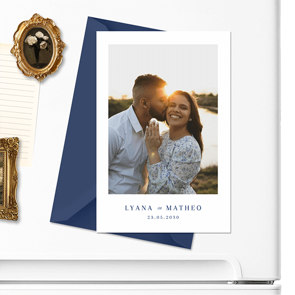 Kondig jullie huwelijk aan met een originele magneetkaart. Dit is een Save the Date op magneetstrip, waardoor het blijft plakken op magnetische achtergrond. Upload zelf jullie mooiste foto op deze foto Save the Date. De tekst wordt in een mooie blauwe trendkleur gedrukt.