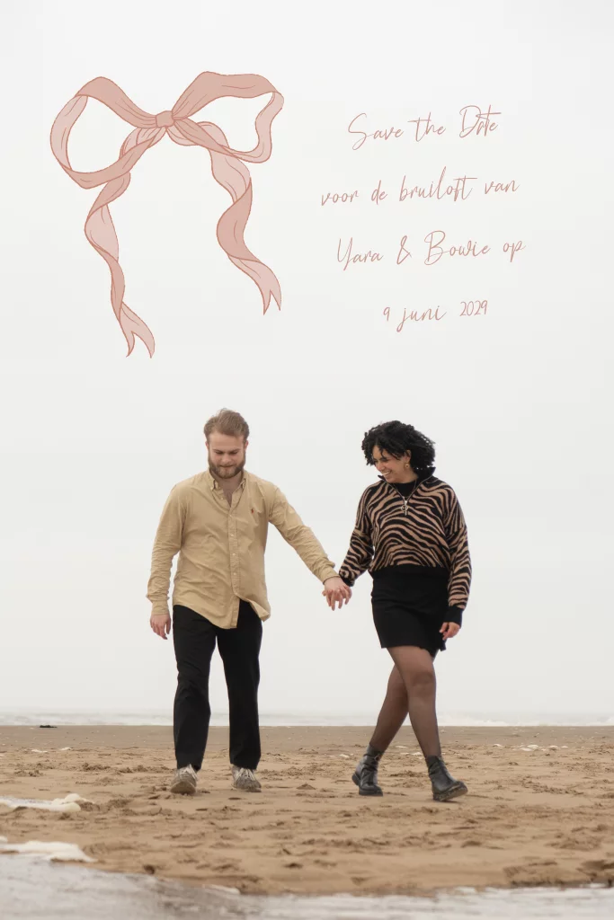 Ontwerp een Save the Date bruiloft met een foto. Dit is een romantische Save the Date met illustratie van een strik. Upload zelf een persoonlijke foto in de editor.