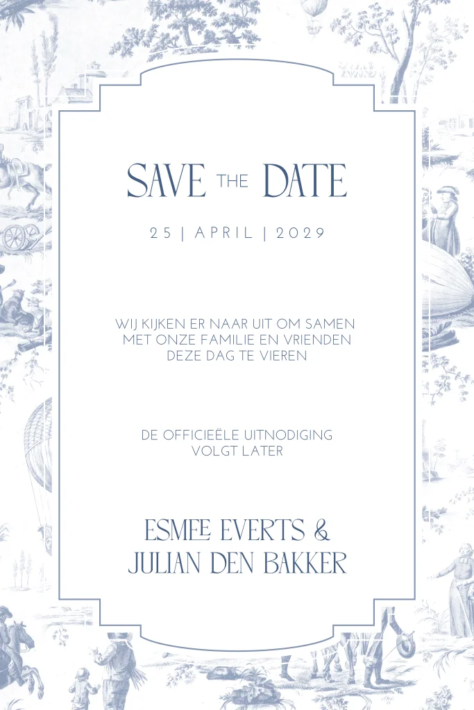 Een romantische Save the Date met Toile de Jouy in blauwe tinten. Dit is een mooie kaart om naar iedereen te sturen om te laten weten wanneer jullie gaan trouwen. Alle aspecten aan deze kaart kunnen worden aangepast. Op de achterkant upload je gemakkelijk jullie mooiste foto.