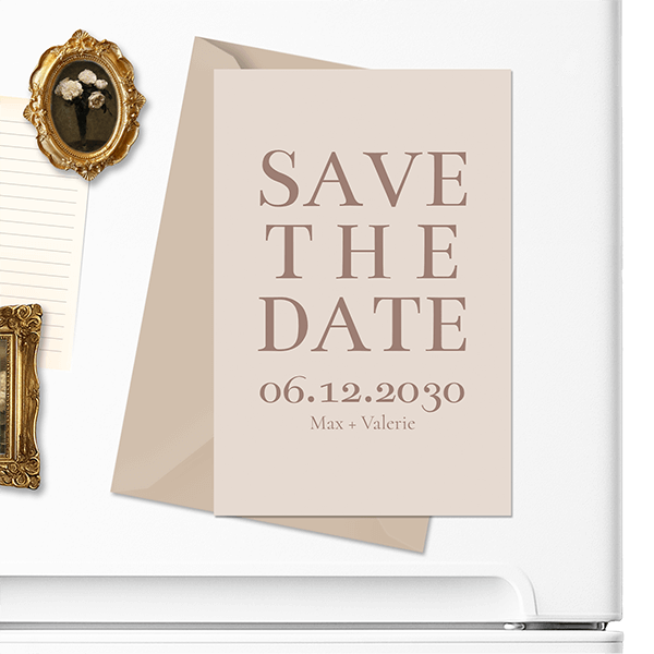 Ontwerp een trend Save The Date kaart in beige. Dit is een Save the Date magneetkaart. De achterkant van deze magneet Save the Date is van magnetisch materiaal. Personaliseer eenvoudig in onze editor voor een unieke aankondiging.