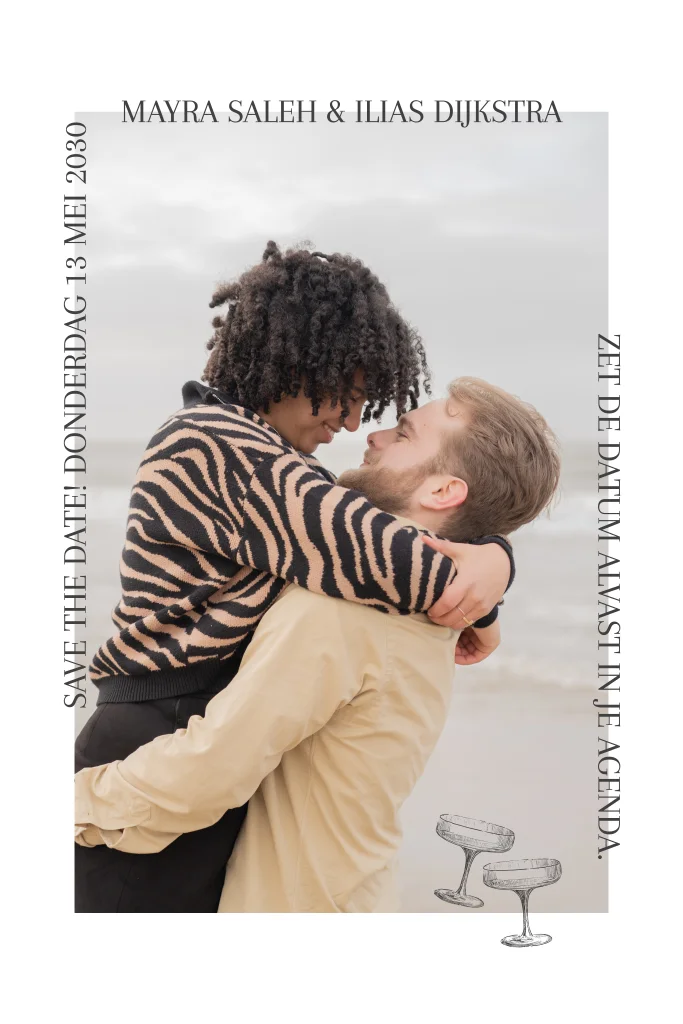 Verstuur deze foto Save the Date om jullie trouwdatum bekend te maken. Dit is een trend Save the Date met grote foto, champagneglazen en op de achterkant een logo van jullie initialen.