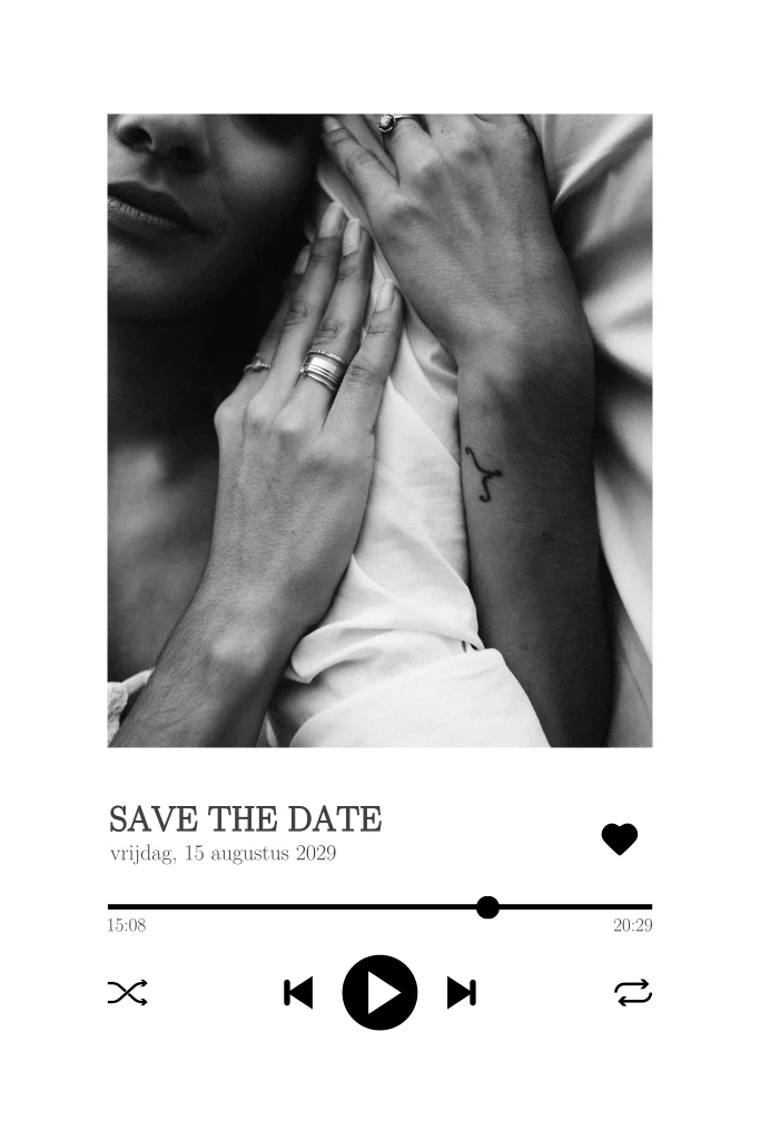 Verstuur een trend Save the Date om jullie trouwdatum bekend te maken. Dit is een Save the Date als een spotify album cover. Je upload gemakkelijk zelf een foto. Zo stuur je een originele spotify Save the Date kaart.