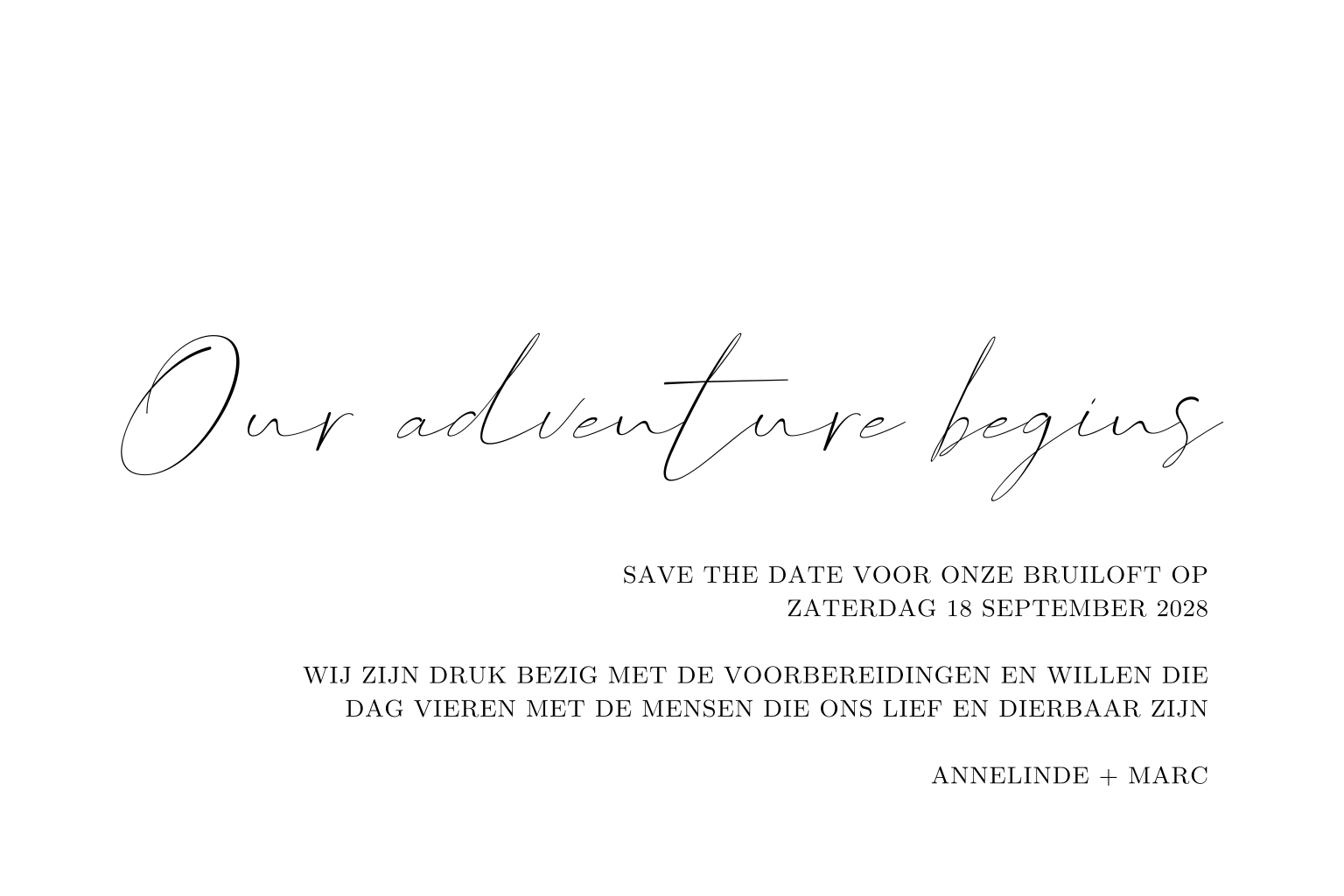 Maak stijlvolle Save the Date kaartjes voor jullie bruiloft met dit voorbeeld. Deze Save the Date kaart heeft ronde hoeken. Je kunt de teksten aanpassen in de kaartopmaker. Daarna bestel je een proefdruk. Tijdens het bestellen kun je kiezen uit verschillende formaten. Voor deze Save the Date kaart adviseren we 10 bij 15 cm. Er is ook een bijpassende trouwkaart te vinden op de site.| Totaalprijs: 0 |