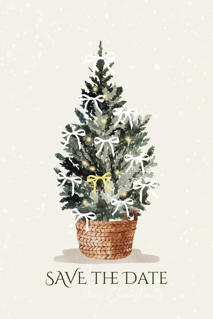 Dit kerst Save the Date kaartje met goudfolie strikjes heeft een luxe en feestelijke uitstraling. Een stijlvolle manier om jullie trouwdatum en een kerstgroet te delen met vrienden en familie.