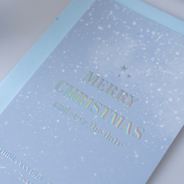 Maak een mooie Save the Date kerstkaart van kalkpapier met sneeuw en holografische folie. Maak de datum van jullie bruiloft bekend met deze stijlvolle uitnodiging. Met een Save the Date kerstkaart kun je zowel vragen of mensen de datum voor je vrijhouden als familie en vrienden een fijn kerst wensen.