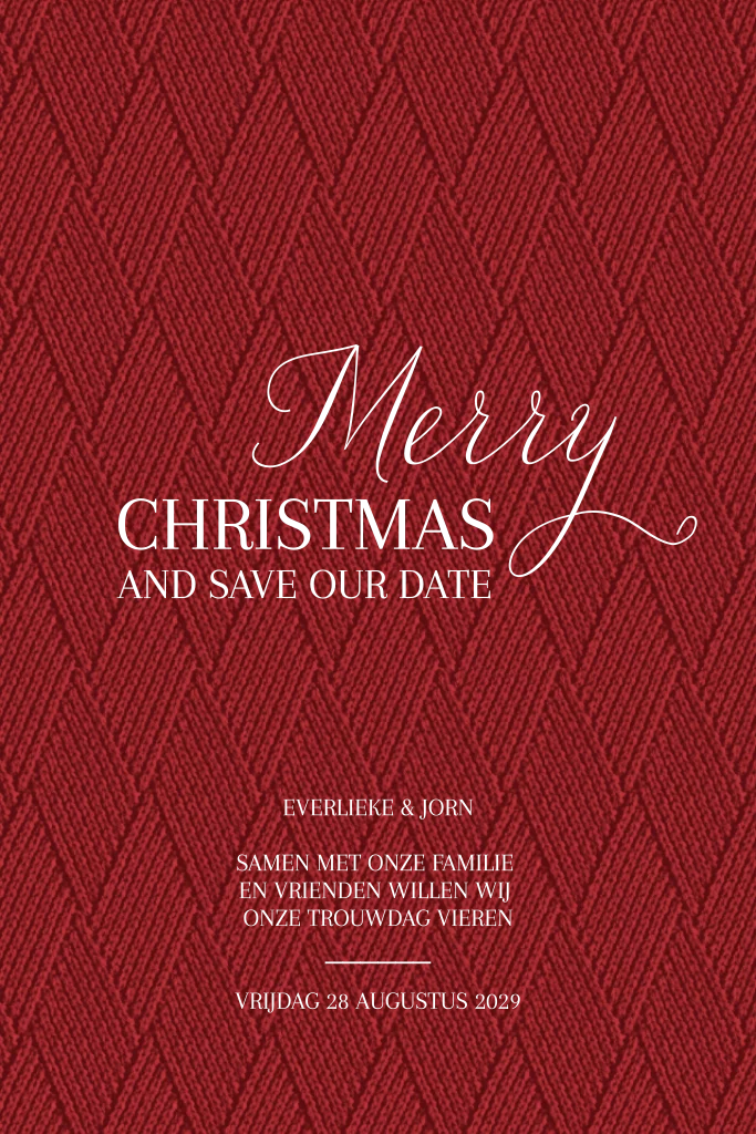 Maak jullie eigen Save the Date kerstkaart met goudfolie en een leuke gebreide textuur. De textuur is niet voelbaar maar kun je wel genadrukken door een zachte papiersoort te kiezen. In de beeldbank staan nog meer leuke achtergronden.