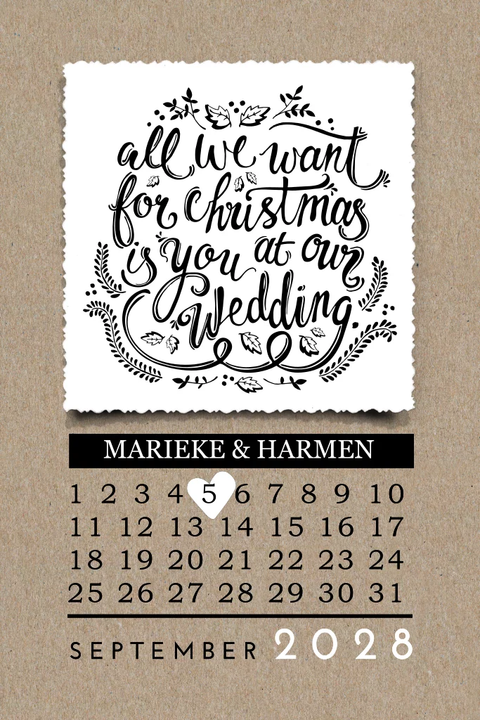 Kerst Save the Date kaart op kraftpapier. Originele tekst om gasten jullie trouwdatum te melden deze kerst.