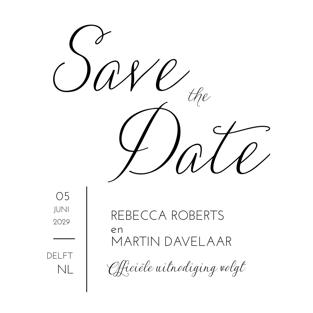 Het klassieke lettertype wordt gecombineerd met strakke lijnen en moderne lettertypes. Maak jullie eigen Save the Date kaart met dit ontwerp. Er is veel mogelijk. Op de achterkant zou je ook een foto kunnen plaatsen.