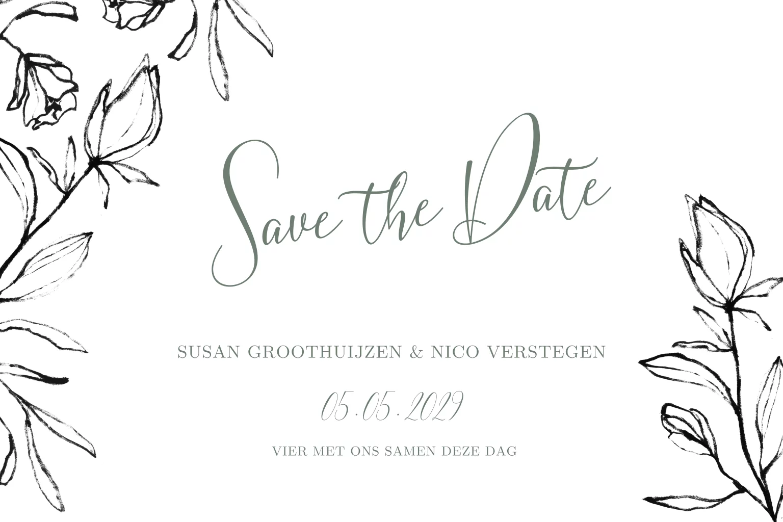 Passend bij de complete trouwhuisstijl bestel je deze Save the Date kaartjes. De teksten en het takje hebben een donker groene kleur maar die kan aangepast worden in de kaartopmaker. Zo maak je altijd een unieke Save the Date. Later bestel je in dezelfde stijl ook een trouwkaart.