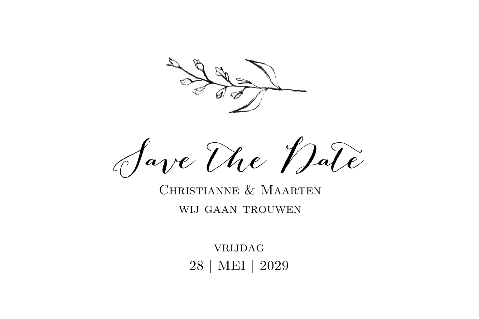 Het getekende takje maakt deze minimalistisch Save the Date kaart bijzonder! Eenvoudig en stijlvol. Je kunt kiezen voor verschillende papiersoorten en verschillende formaten.