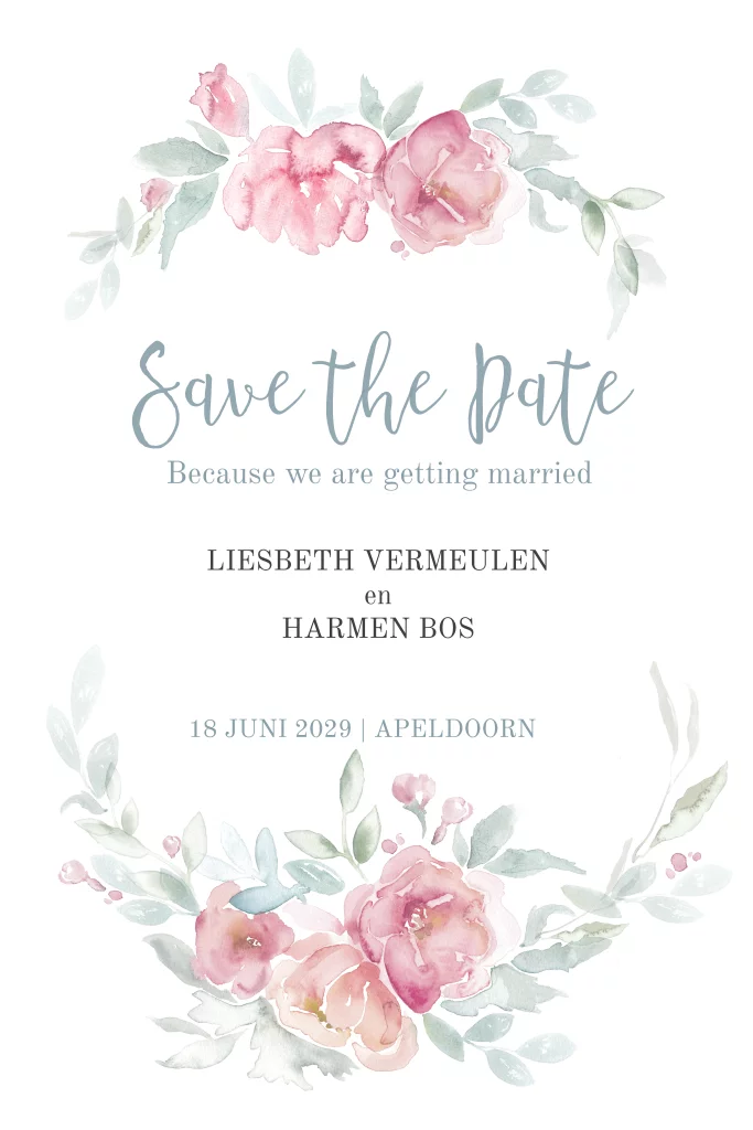 Romantische staande Save the Date kaart met watercolor bloemen. Een lieve uitstraling heeft deze Save the Date. Past deze sfeer bij jullie stijl? Wijzig in de kaartopmaker de teksten naar jullie wensen en bestel een proefdruk. Je kunt tijdens het bestellen kiezen voor het formaat, papiersoort en de kleur van dee envelop.