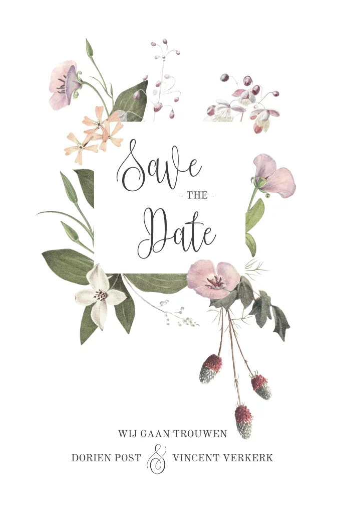 Save the date kaart met bijzondere afbeelding van bloemetjes en plantjes heeft deze uitnodiging voor jullie bruiloft. In de beeldbank hebben we een map met verschillende details van deze bloemetjes en plantjes. Zo kun je altijd een unieke trouwkaart maken.