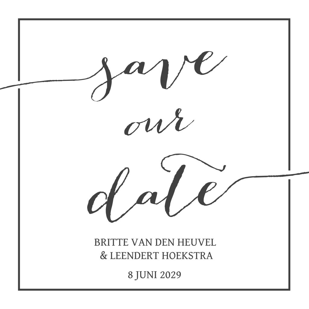 Deze Save the Date kaart heeft een mooi onderbroken kader voor de woorden Save the Date. Een trendy lettertype met toch een hele chique uitstraling. Klik op BEWERK DEZE KAART en vul jullie eigen namen en trouwdatum in op deze mooie kaart.