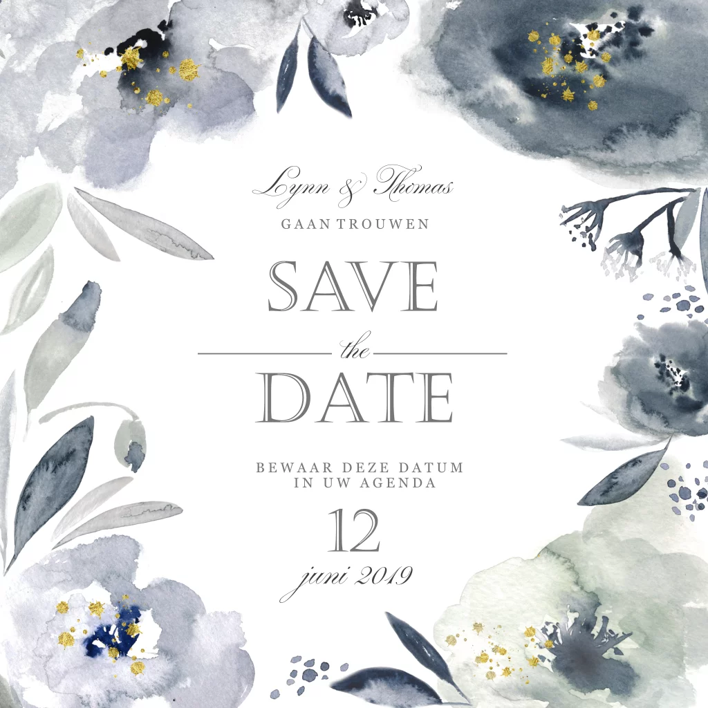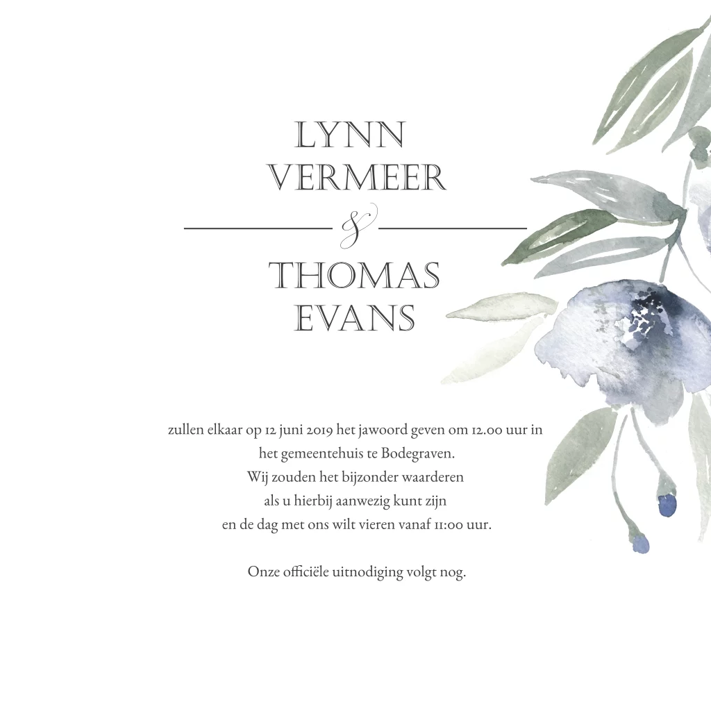 De zachte blauwe botanische bloemen maken deze Save the Date kaart bijzonder. Neem ook een kijkje bij de overige kaarten in de trouwhuisstijl Blooming Jewels. De typografie bestaat uit prachtige combinaties van verschillende letters. Maak de kaart persoonlijk door jullie teksten in te voegen.