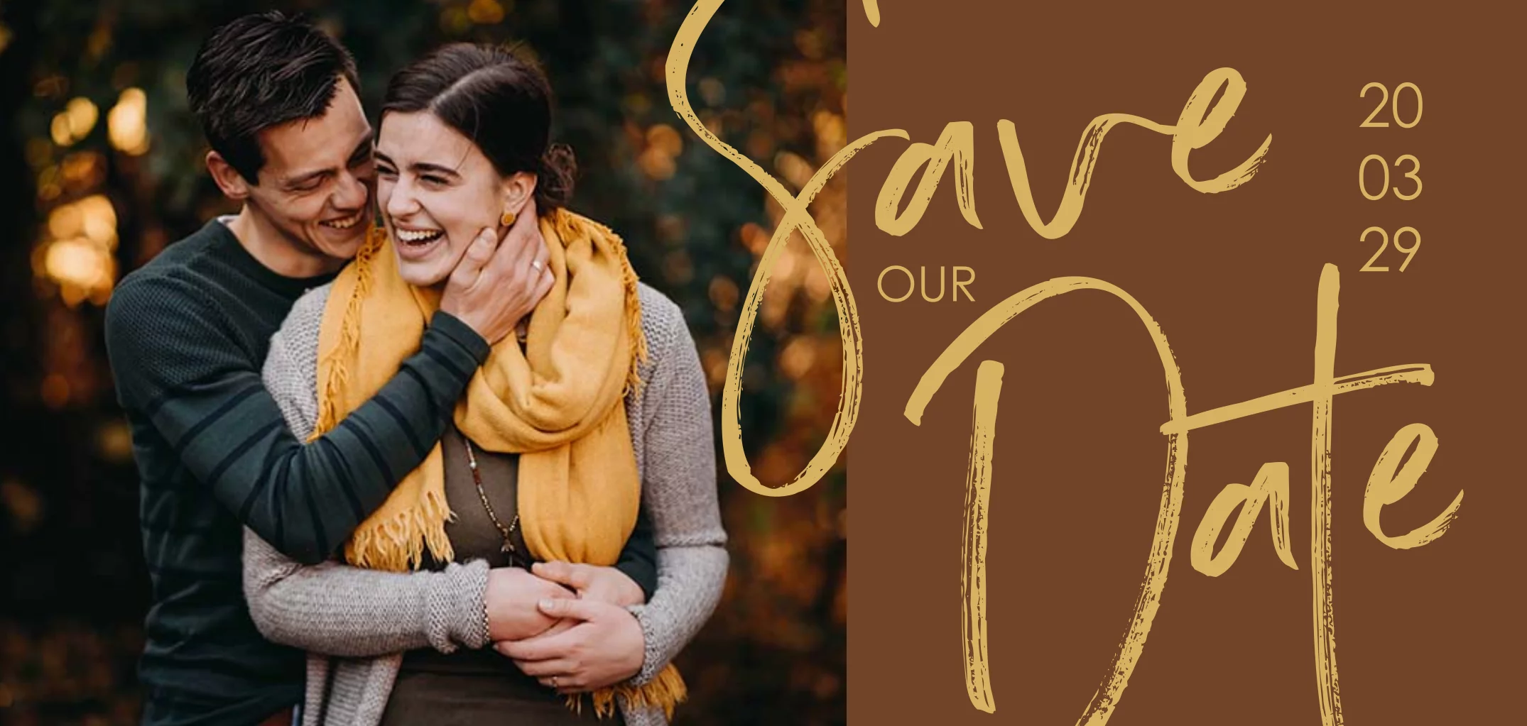 Een moderne Save the Date kaart met foto en grote tekst. Wij hebben gekozen voor mooie kleurtinten die terug komen in de foto. Heb je een andere kleur in gedachten? In de kaartopmaker kun je eenvoudig een andere kleur kiezen.