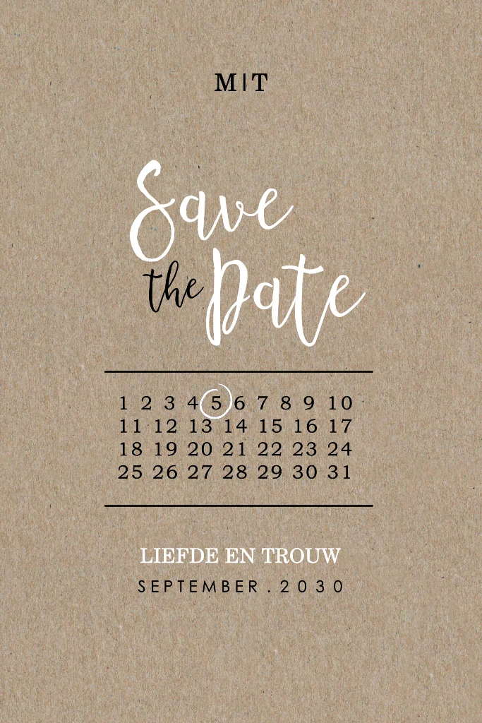 Een kraft Save the Date kaart met kalender om jullie trouwdatum te markeren. Deze Save the Date wordt afgedrukt op echt kraftpapier.