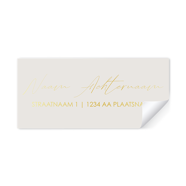 Een stijlvolle adressticker met goudfolie. Per vel zijn er 12 stickers van 97x45mm met rechte hoeken. Eenvoudig zelf het adres in de voeren. De namen worden met sierlijke letters gedrukt. Kies eerst hoeveel vellen je wilt bestellen voordat je verder gaat.