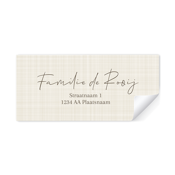 Maak zelf adresstickers bij een trouwkaart, zo hoef je niet zelf alle adressen te schrijven. Dit zijn adresstickers met een linnenlook. Op het vel zitten 12 stickers van 97x45mm. Je voert zelf de adressen in per stuk en per vel. Kies eerst hoeveel vellen je nodig hebt.| Totaalprijs: 0 |