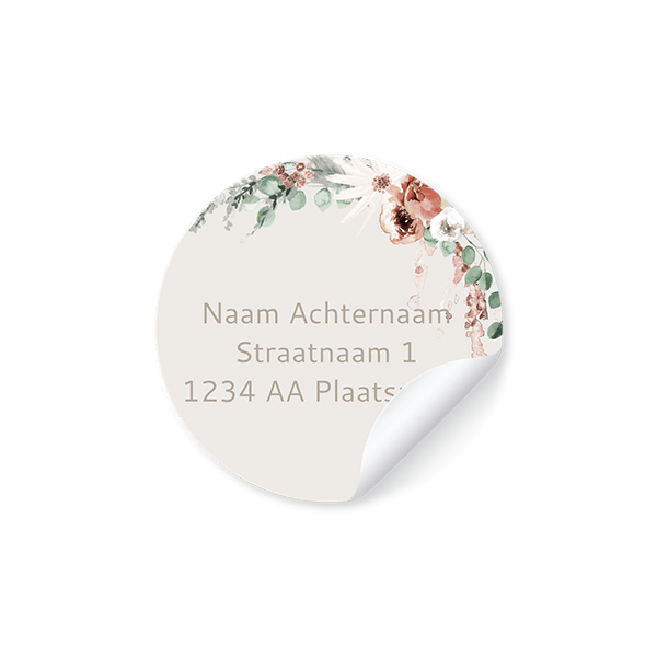 Ontwerp ronde adresstickers in taupe met bloemetjes.