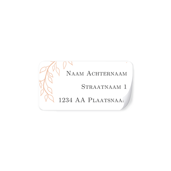 Adresstickers die passen bij de trouwkaart met het takje in roséfolie. In dezelfde stijl bestel je deze stickers met adressen. Deze adresstickers hebben afgeronde hoeken en zijn 65x34mm. Je bestelt ze per 24 stuks op een vel. Kies eerst hoeveel vellen je wilt voordat je verder gaat.