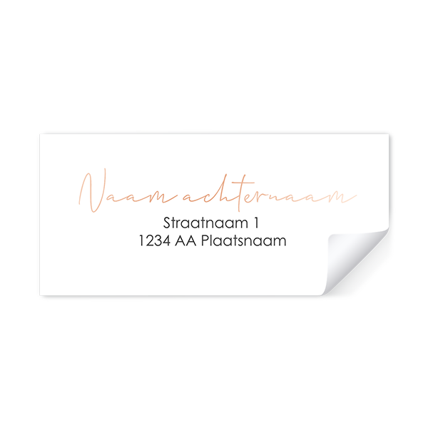 Maak zelf klassieke adresstickers bij een klassieke trouwkaart. Op het vel zitten 12 stickers van 97x45mm. Je voert zelf de adressen in per stuk en per vel. Op deze adresstickers wordt roséfolie gedrukt. Wil je liever een andere kleur folie? Dit pas je eenvoudig aan in de editor. Kies eerst hoeveel vellen je nodig hebt voordat je verder gaat.