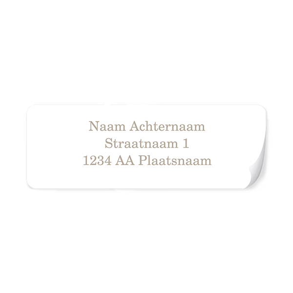 Maak zelf adresstickers van 97x34mm met ronde hoeken. In de beeldbank staat alles wat nodig is om deze sticker naar jullie stijl te maken. Als je een gekleurde achtergrond wilt hebben moet deze kleur in sterk contrast zijn tot de tekst, Zorg er voor dat de tekst goed leesbaar is.