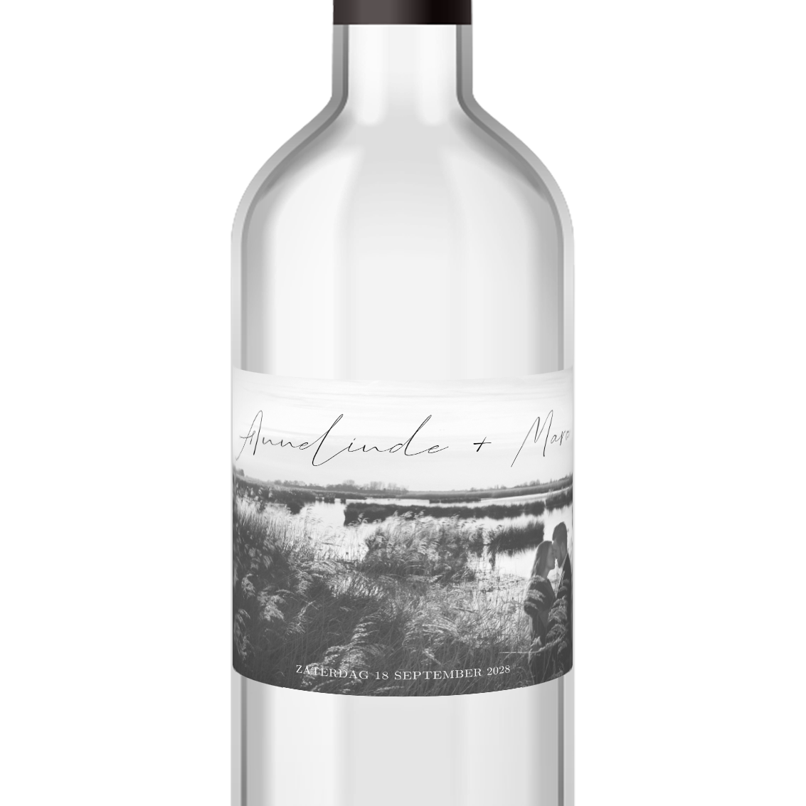 Ontwerp je eigen wijnfles etiket met een persoonlijke foto. Dit ontwerp past bij de trouwkaart; stijlvolle trouwkaart met ronde hoeken.| Totaalprijs: 0 |
