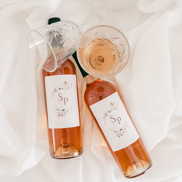 Dit stijlvolle etiket wijnfles maakt deel uit van een trouwkaartenset.
