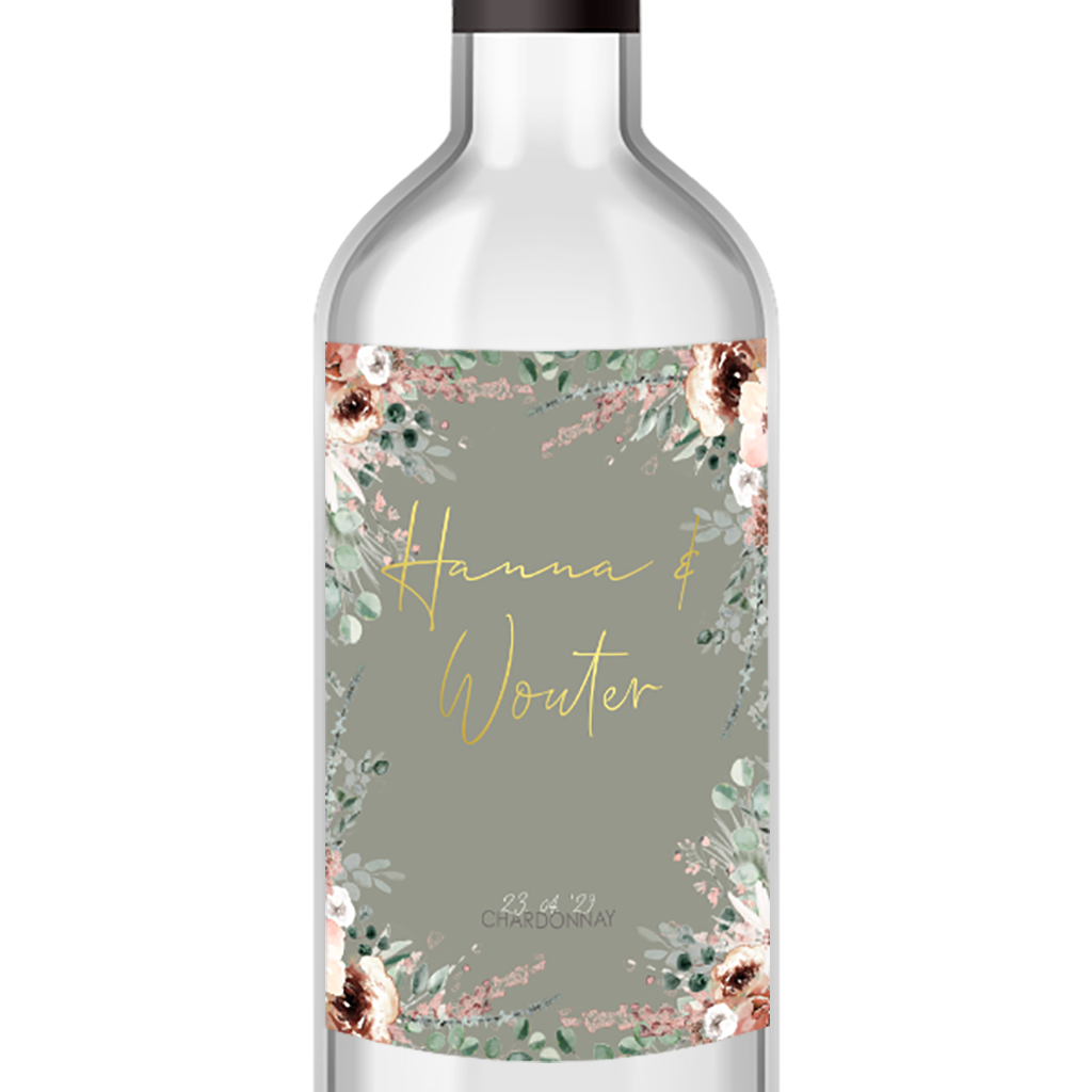 Personaliseer je wijnflessen met deze romantische sticker. Dit is een etiket met bloemen en jullie namen in goudfolie.| Totaalprijs: 0 |