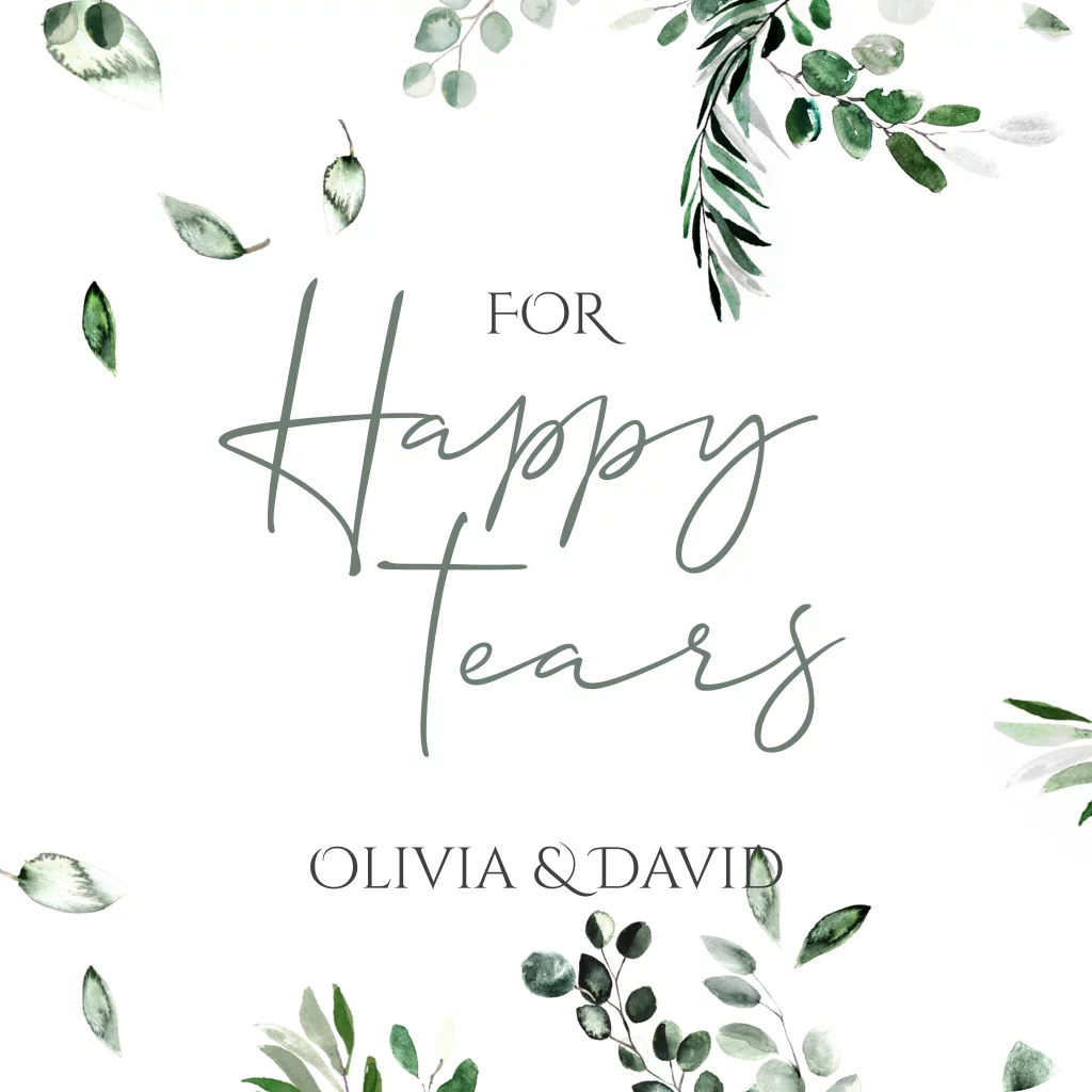 Voorzie jullie gasten met zakdoekjes voor hun happy tears tijdens jullie bijzondere dag. Plak deze mooie sticker erop die past bij de trouwkaart; pocketfold trouwkaart met eucalyptus blaadjes. De stickers kunnen het beste op de verpakking van de zakdoekjes geplakt worden, maar op de zakdoekjes zelf kan ook. Wij leveren alleen de stickers en niet de zakdoekjes.* Ontwerp in stijl van de kaart