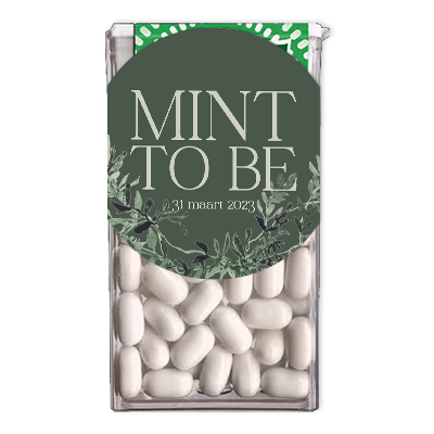 Plak deze sticker op een tic tac doosje om aan je gasten te geven tijdens de kerkdienst of als bedankje. Deze sticker past bij de trouwkaart; GROENE KAARTENSET VOOR POCKETFOLD MET BLAADJES.* Ontwerp in stijl van de kaart