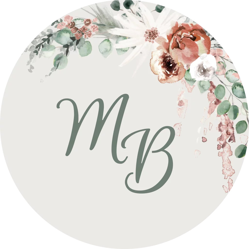 Ontwerp een sluitsticker met bloemetjes en jullie initialen. Deze sluitsticker past bij een trouwkaart in dezelfde stijl.