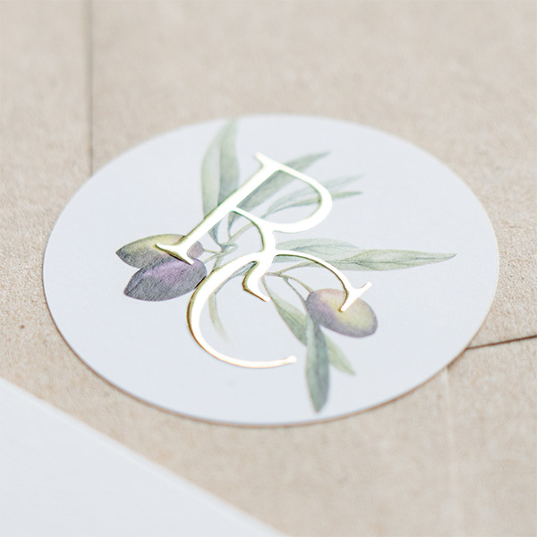 Bestel een sluitsticker om een envelop mee dicht te maken. Dit is een trend sluitzegel met olijftakje en een logo in goudfolie. Verschillende formaten mogelijk