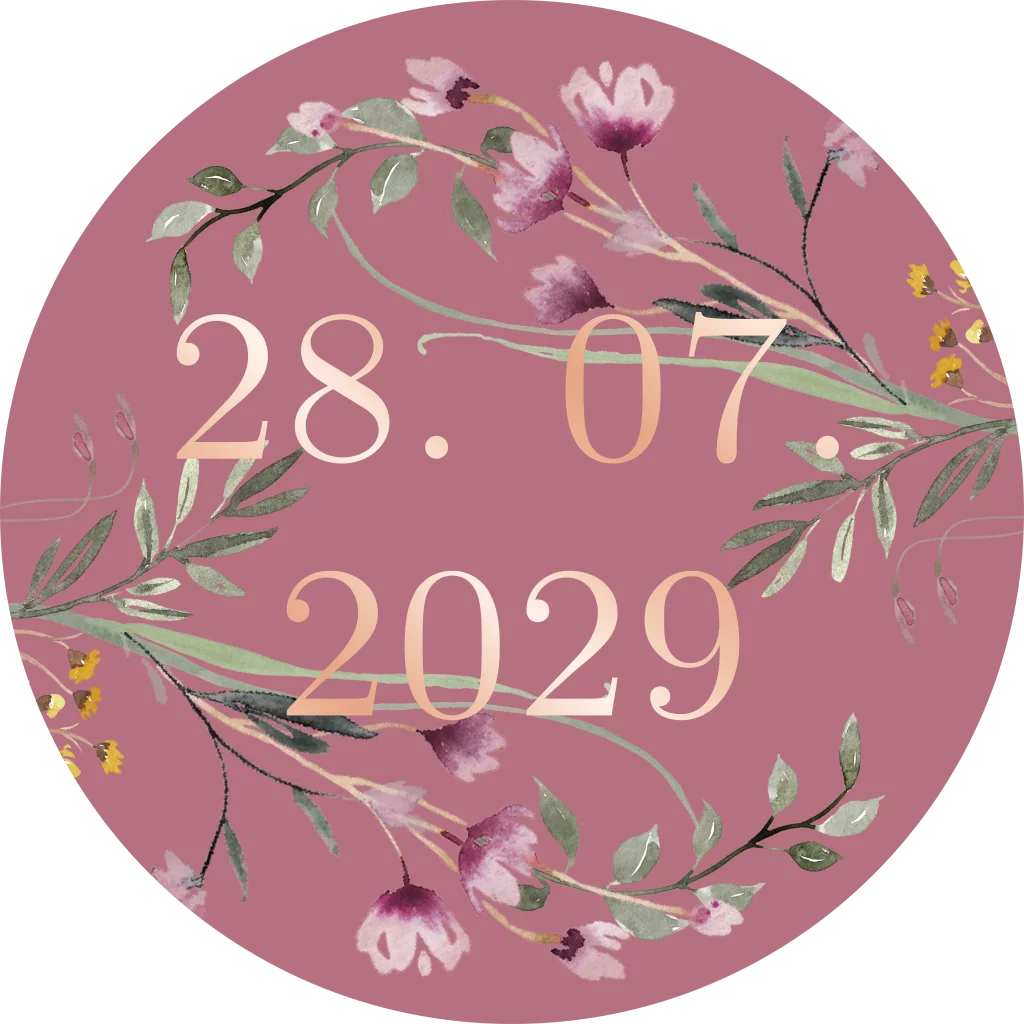 Ontwerp een romantische sluitsticker in roze met bloemen. De tekst op deze sticker wordt in roséfolie gedrukt. Verschillende formaten mogelijk