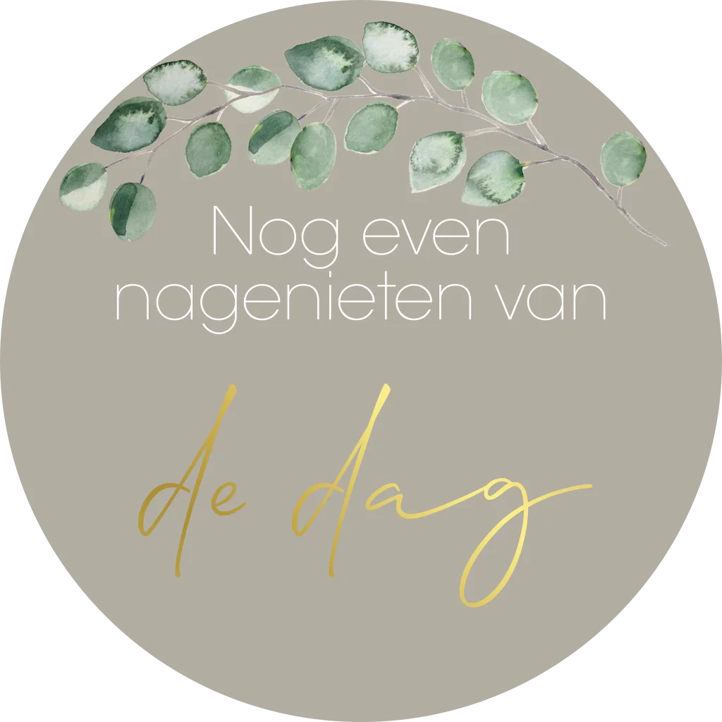 Een sticker in taupe met goudfolie. Plak deze sticker op bedankjes die de gasten aan het einde van de trouwdag meekrijgen. Zo maak je de bedankjes origineel en persoonlijk. Je bestelt de stickers per vel.* Ontwerp in stijl van de kaart