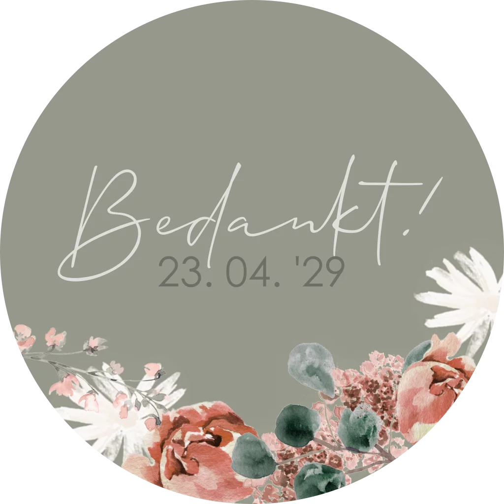 Deze sticker met bloemen voor bedankjes maakt deel uit van de trouwkaarten set Hanna.