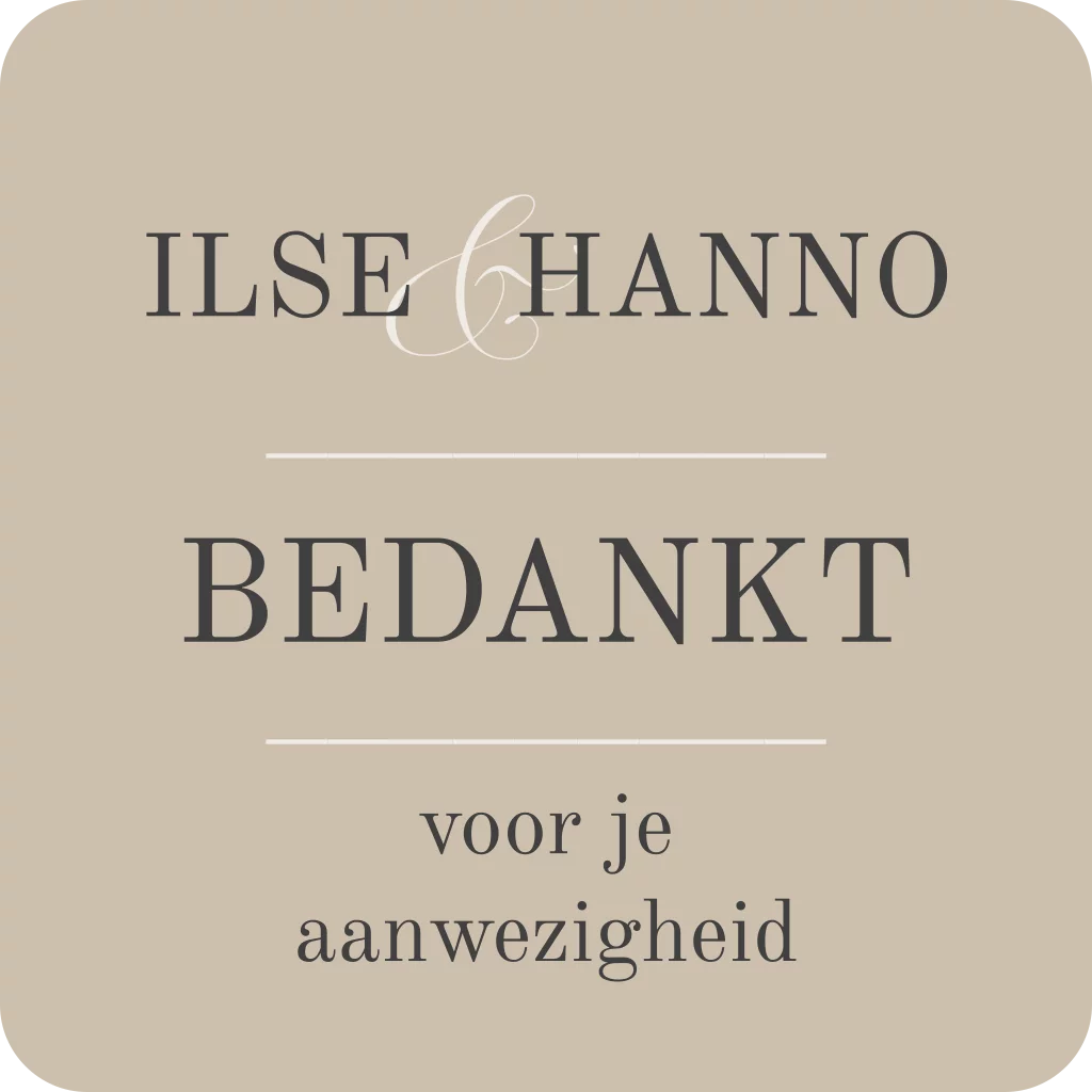 Plak op de bedankjes voor de bruiloft een sticker. Dit is een vierkante sticker met ronde hoeken in taupe. Je kan in de editor de teksten aanpassen naar wens. Je bestelt de stickers per vel, er zitten 25 stickers op een vel.* Ontwerp in stijl van de kaart