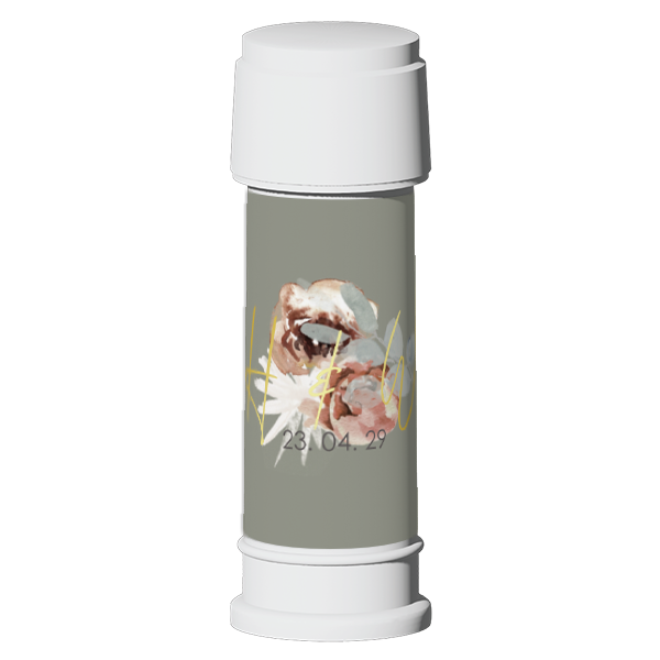Plak deze sticker op een bellenblaas. Dit is een sticker met bloemen en jullie initialen in goudfolie.