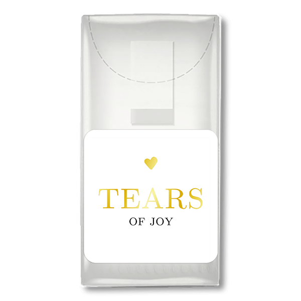 Happy tears sticker voor op je zakdoekjes tijdens de bruiloft. Ontwerp je zelf een mooie sticker for your happy tears. Dit is een klassieke sticker met tekst in goudfolie. De stickers kunnen het beste op de verpakking van de zakdoekjes geplakt worden, maar op de zakdoekjes zelf kan ook.