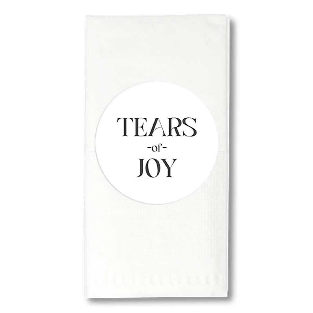 Plak de sticker op zakdoekjes voor je gasten en hun tears of joy. Maak je eigen ontwerp passend bij jullie bruiloft. De stickers kunnen het beste op de verpakking van de zakdoekjes geplakt worden, maar op de zakdoekjes zelf kan ook. Let op: Je bestelt alleen de stickers, niet het getoonde voorbeeldproduct.
