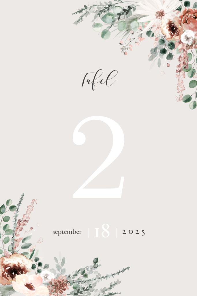 Maak een bohemian tafelnummer kaart voor jullie bruiloft. Op de voor- en achterkant wordt het nummer in goudfolie gedrukt.| Totaalprijs: 0 |