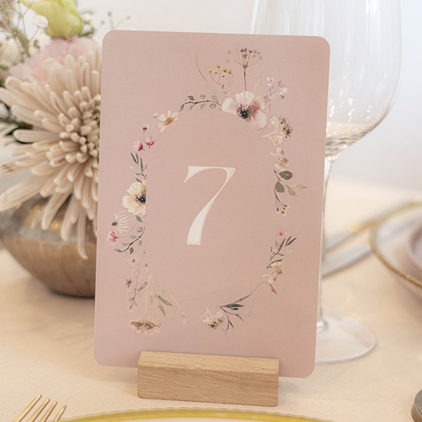Maak een romantisch tafelnummer voor jullie diner in roze met een bloemenkrans. Let op dat je het nummer op de achterkant ook aanpast.