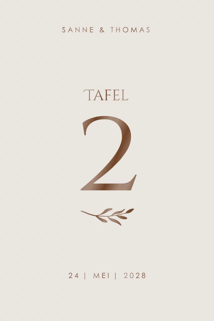 Dit stijlvolle tafelnummer bordje maakt deel uit van de trouwkaarten set Sanne & Thomas.