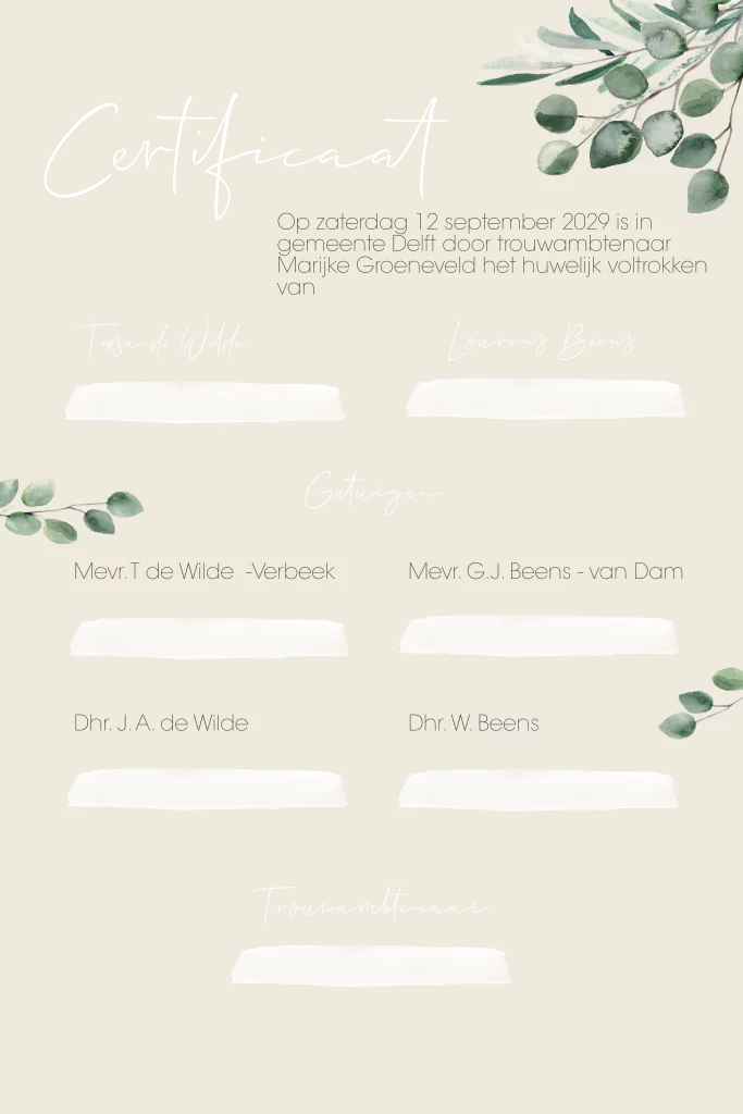 Maak een botanische trouwakte voor tijdens de ceremonie. Op deze trouwakte met blaadjes en goudfolie is genoeg ruimte voor het invullen van de handtekeningen. In de editor pas je de namen aan en maak je de trouwakte persoonlijk.