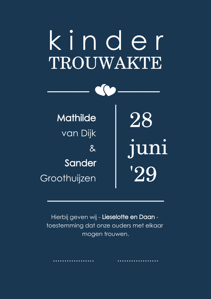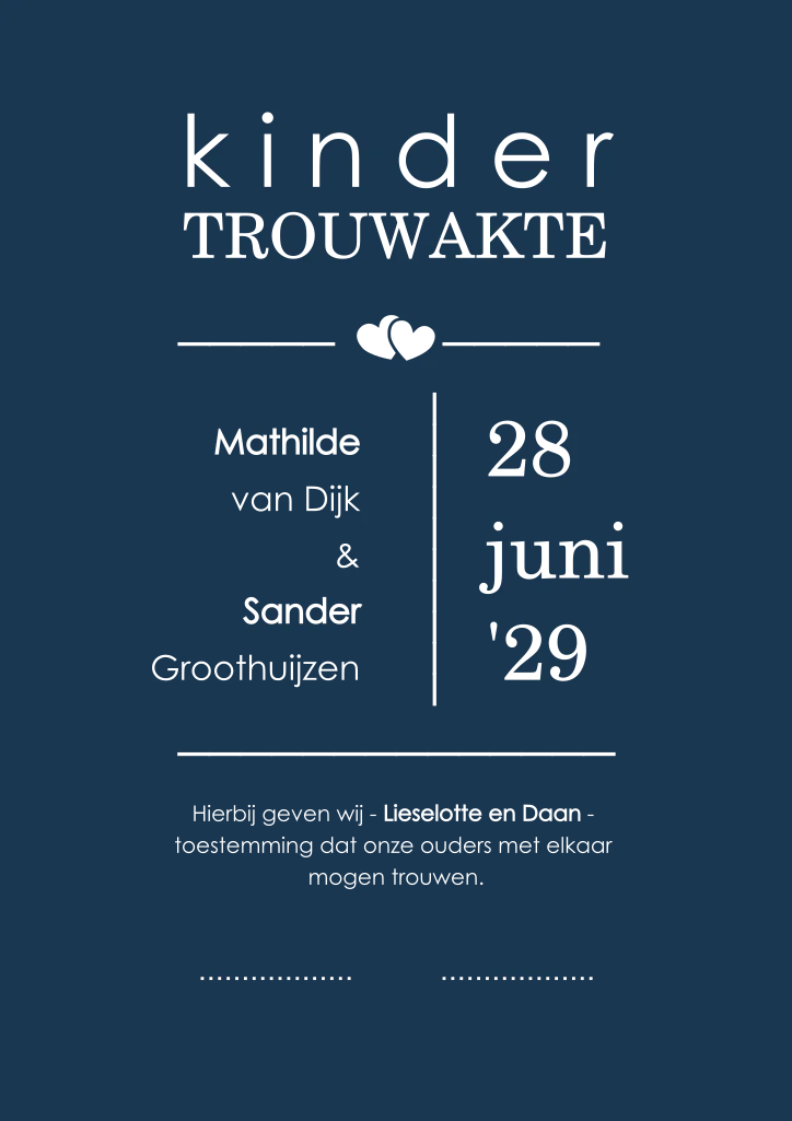 Maak je eigen kindertrouwakte voor de ceremonie in onze kaartopmaker. Je kunt gebruik maken van onze uitgebreide beeldbank. Alle teksten en kleuren kunnen aangepast worden zodat deze kinderakte bij de stijl en sfeer van jullie bruiloft past. Is de kinderakte naar wens, dan kun je deze bestellen. Wij leveren snel.