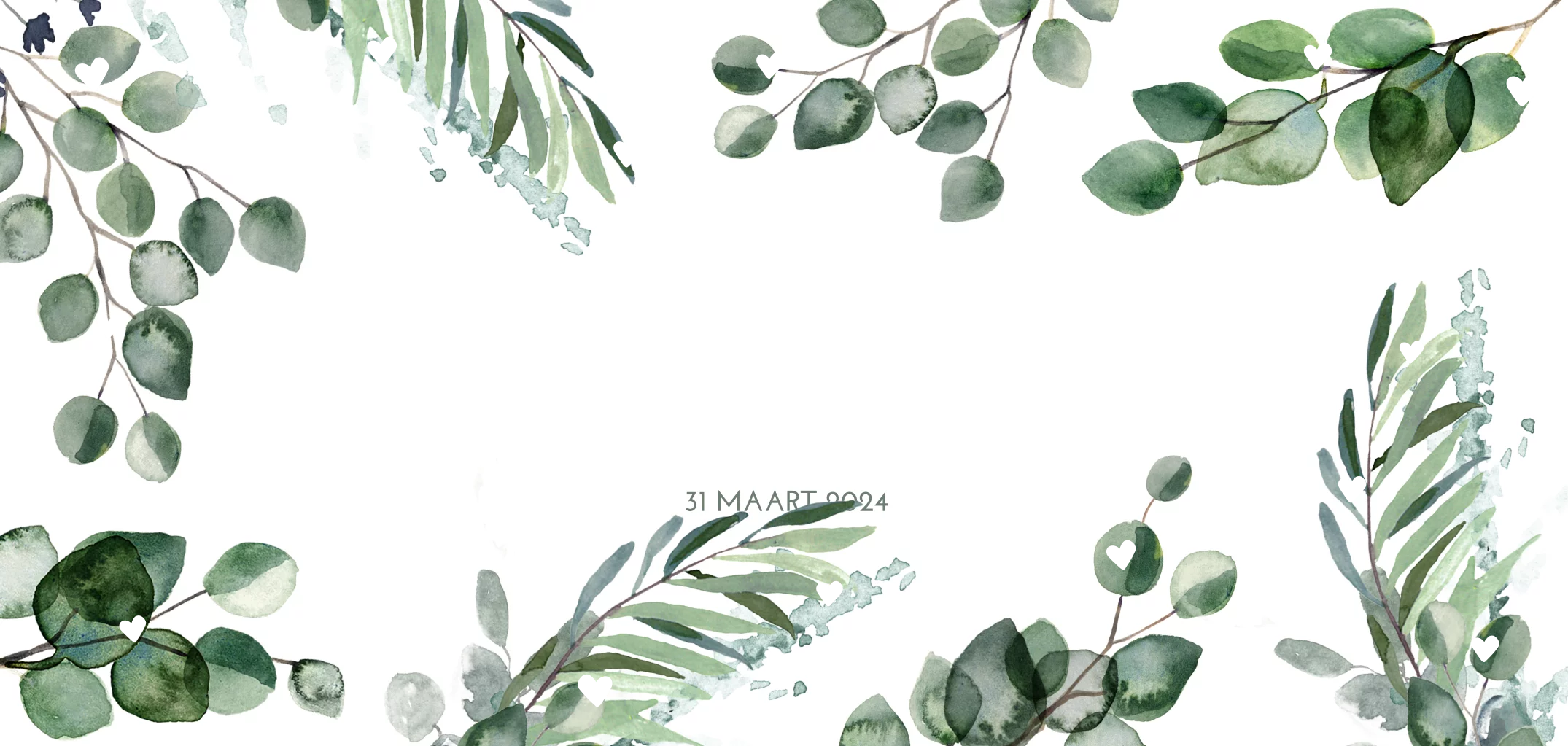 Een bedankkaart met goudfolie en blaadjes. Stuur na de bruiloft deze bedankkaart naar jullie familie en vrienden. Schrijf in de kaartopmaker een persoonlijke tekst. Op de achterkant kun je een foto uploaden.