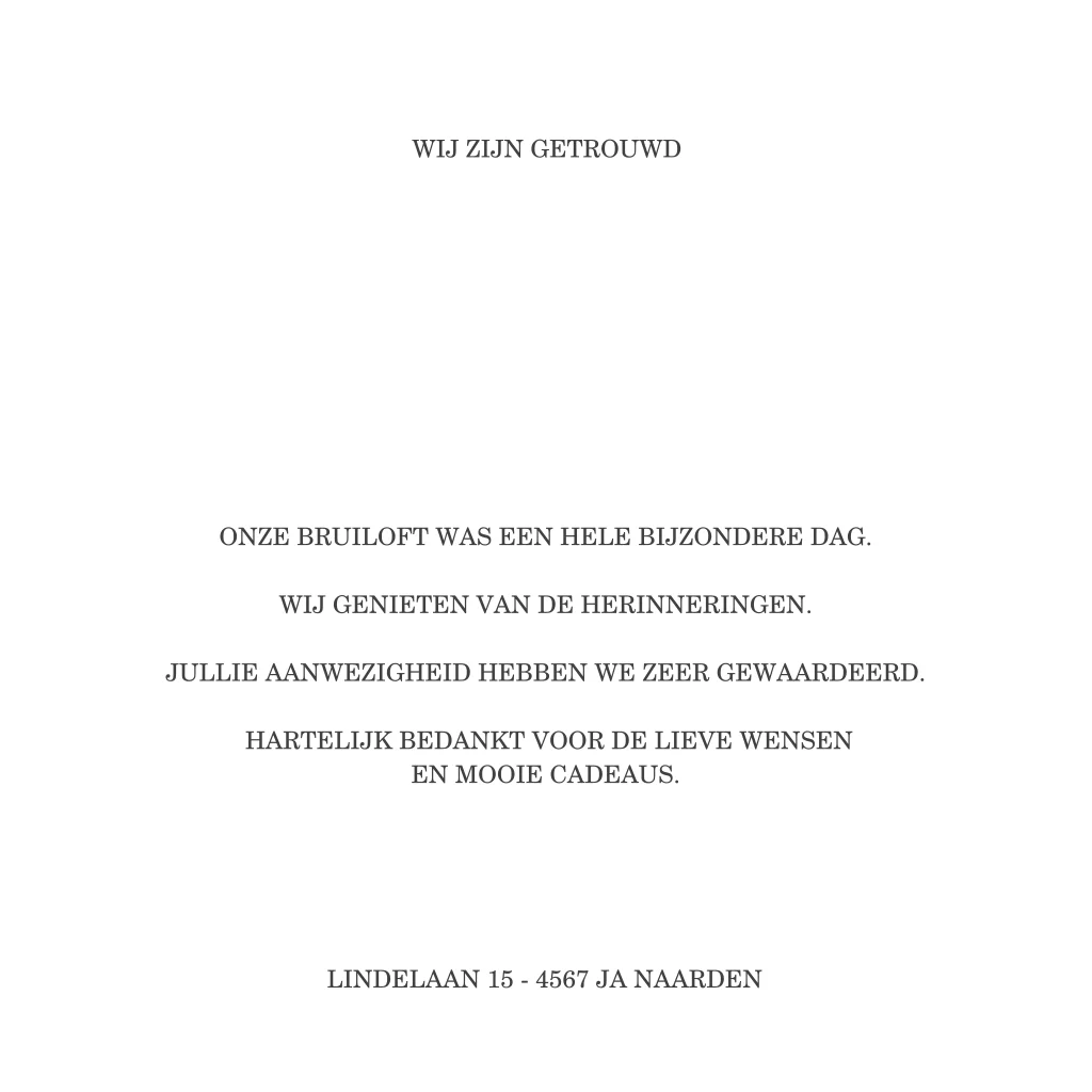 Stuur jullie gasten deze mooie bedankkaart met goudfolie en jullie trouwfoto. Liever goudfolie of zilverfolie? In de kaartopmaker kun je dit eenvoudig aanpassen. Hulp nodig? Laat het ons weten want we helpen jullie graag.| Totaalprijs: 0 |