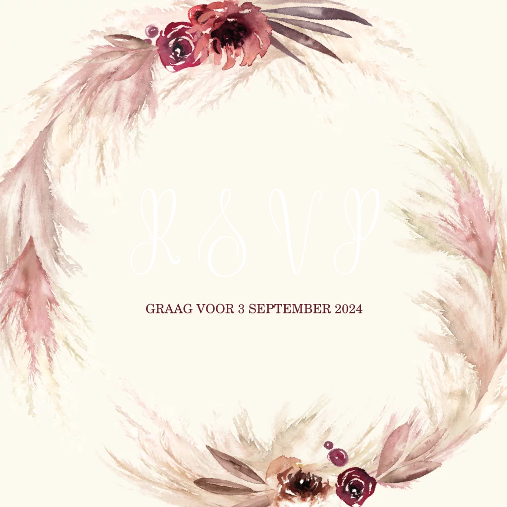 Passend bij de trouwhuisstijl Bohemian Classic kun je dit RSVP kaartje bestellen. Dit kaartje wordt gedrukt met echte roséfolie.