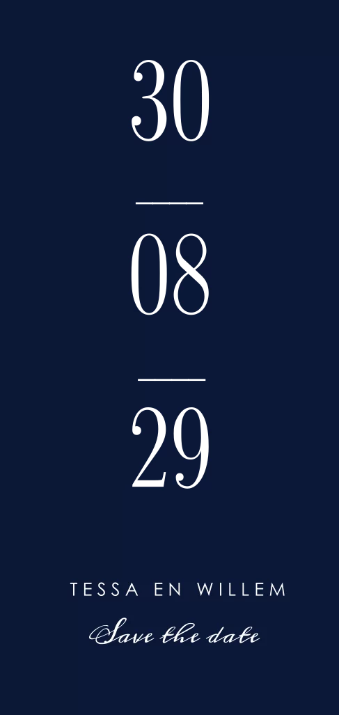 Laat jullie trouwdatum goed opvallen op deze Save the Date kaart met een donkerblauwe achtergrond. In de kaartopmaker kun je elke andere kleur achtergrond kiezen.